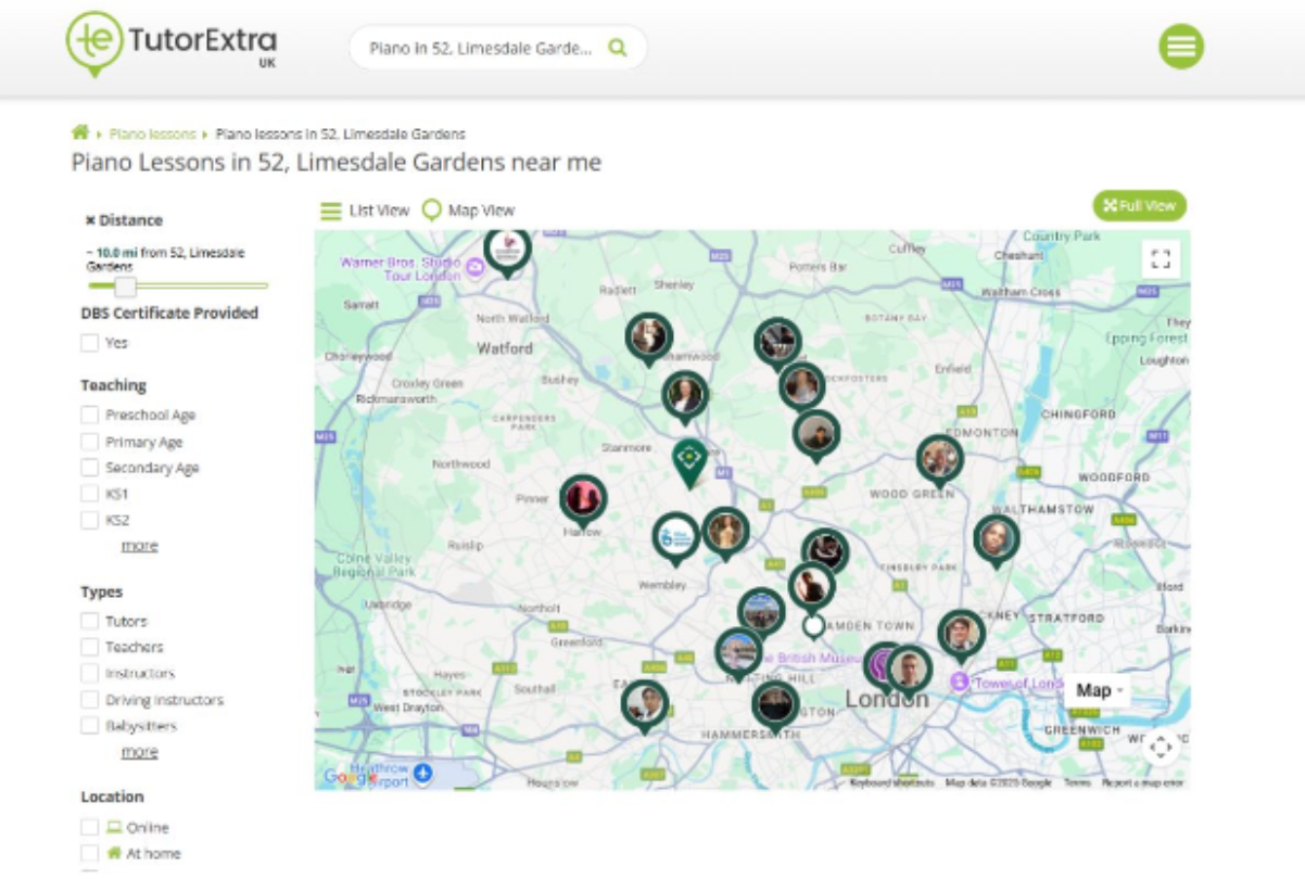 TutorExtra makes it easy for users to see nearby tutors at a glance by displaying an interactive map immediately after any UK location search, from postcode entries to individual street names.
